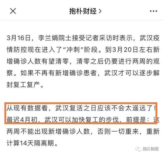 3月18日,我在抱朴财经发表过一篇文章《休克的武汉经济何时复活?》,当时武汉的几位朋友对武汉“解封”(即武汉人赴外地上班,以及滞留武汉的人离开武汉,企业加速复工)表示悲观,认为到六月份都没有希望,官方当时也未明确表态,我们当时根据信息综合判断,明确写下这样的句子——“从现有数据看,武汉复活之日应该不会太遥远了!最迟4月初,武汉可以加快复工的步伐……”