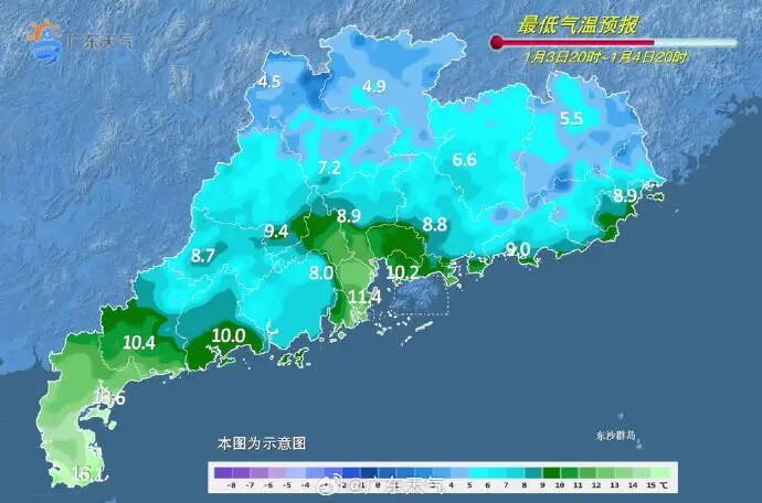 1月3日—4日,全省大部晴间多云,昼夜温差大,早晚寒冷。最低气温:粤北、珠三角北部市县2~5℃,其中高海拔山区-4~0℃,有霜冻和冰冻,粤西沿海市县10~14℃,其余市县6~9℃。