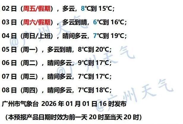 广州市气象台预计,1月2日—3日,受较强冷空气影响,广州多云到晴,最高气温下降至15℃左右。这次降温最低气温将出现在1月3日早晨:北部3~5℃(山区-2~1℃,局部有霜/冰冻),中部5~7℃,南部7~9℃;陆地阵风将加大至5~7级,港区和高地阵风7~9级。1月4日起广州总体维持晴朗干燥天气,气温小幅波动。