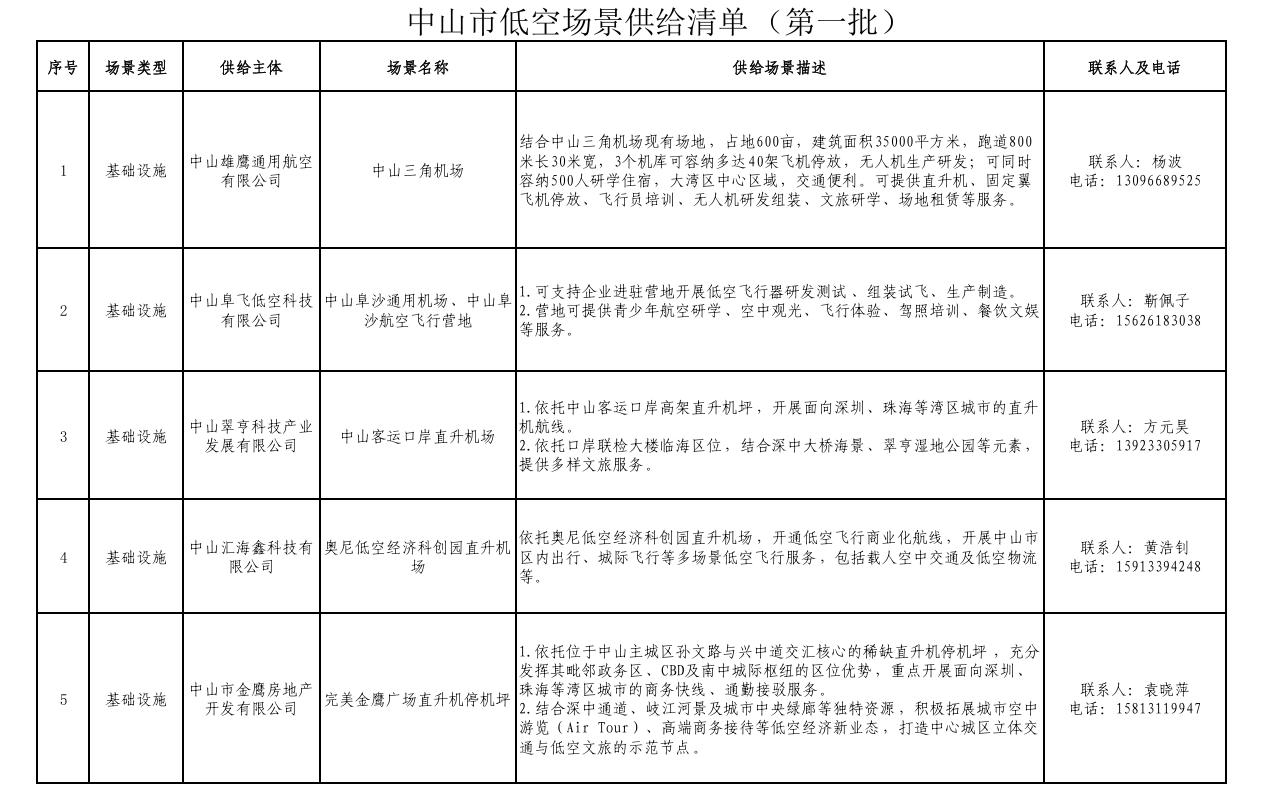 1月14日,中山市发展和改革局发布中山市低空场景供需首批清单。清单涵盖52项创新应用场景,旨在贯彻落实《中山市低空经济高质量发展行动方案(2024—2027年)》,加快低空新场景培育与新产品、新业态推广应用。