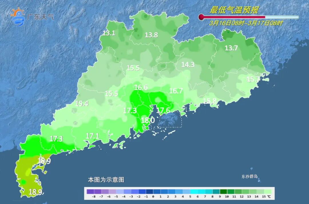 最低气温:粤北、珠三角北部和西部、粤东偏北市县14~17℃,其余市县17~21℃。