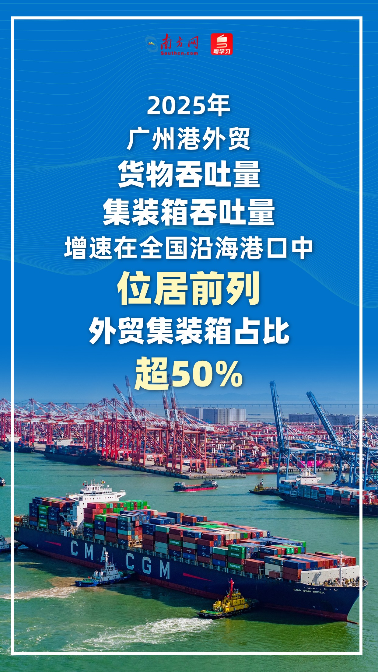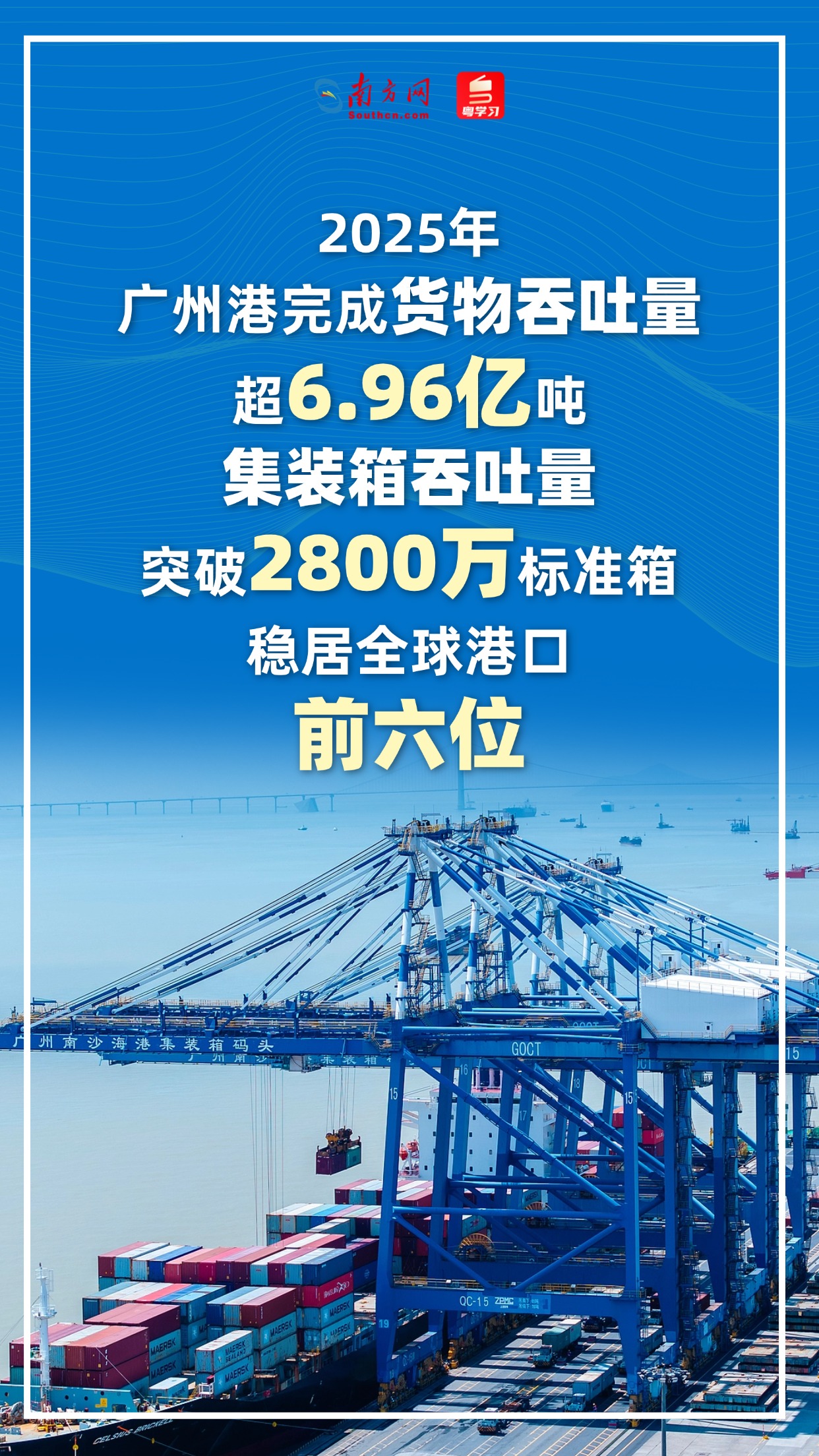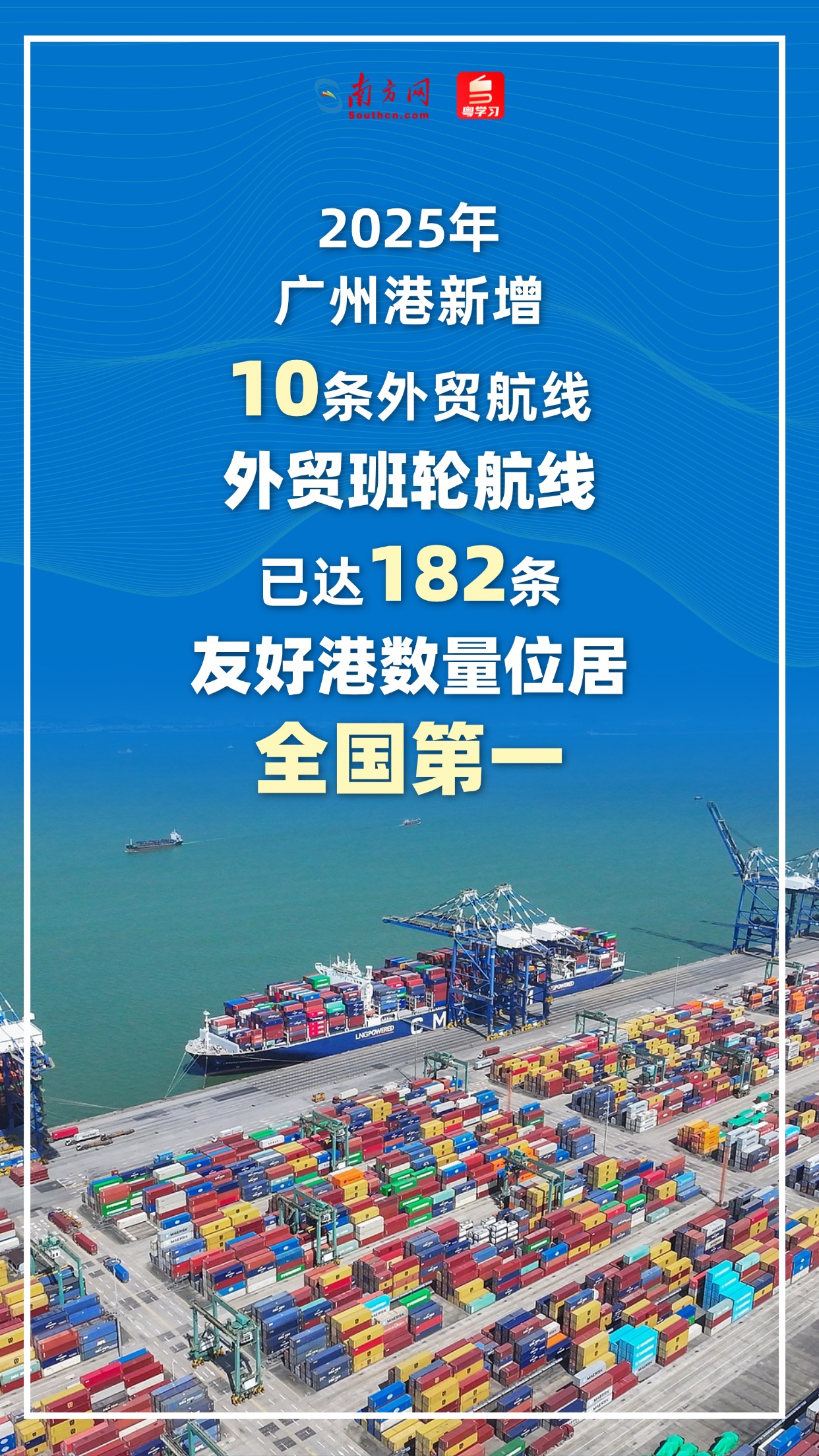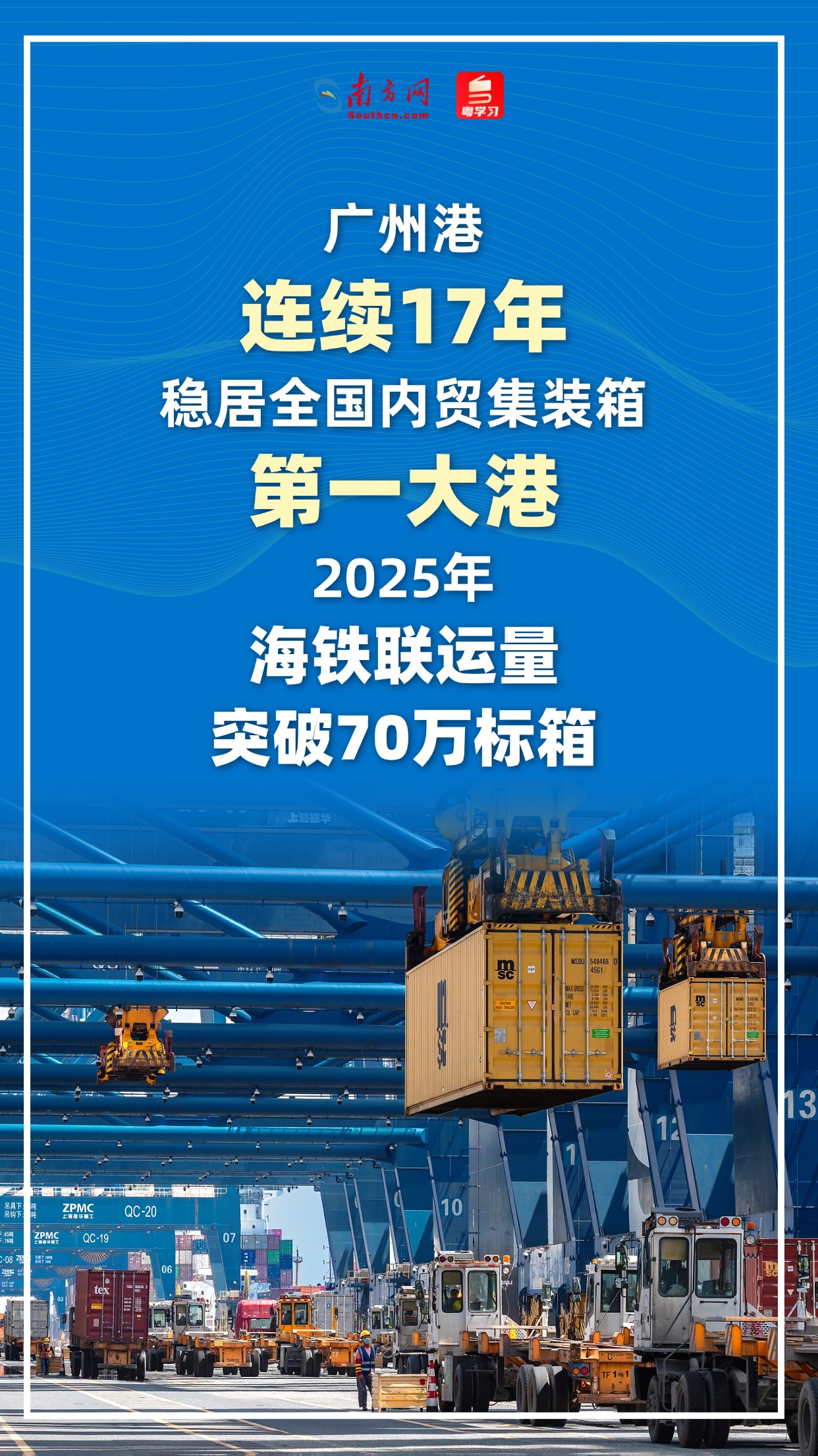 广州港是华南地区最大的综合性主枢纽港和集装箱干线港,也是中国内贸集装箱第一大港。2025年,广州港完成货物吞吐量超6.96亿吨、集装箱吞吐量突破2800万标准箱、外贸班轮航线达182条、海铁联运量突破70万标箱……这个“内贸第一大港”,成功转型为“双循环枢纽”。