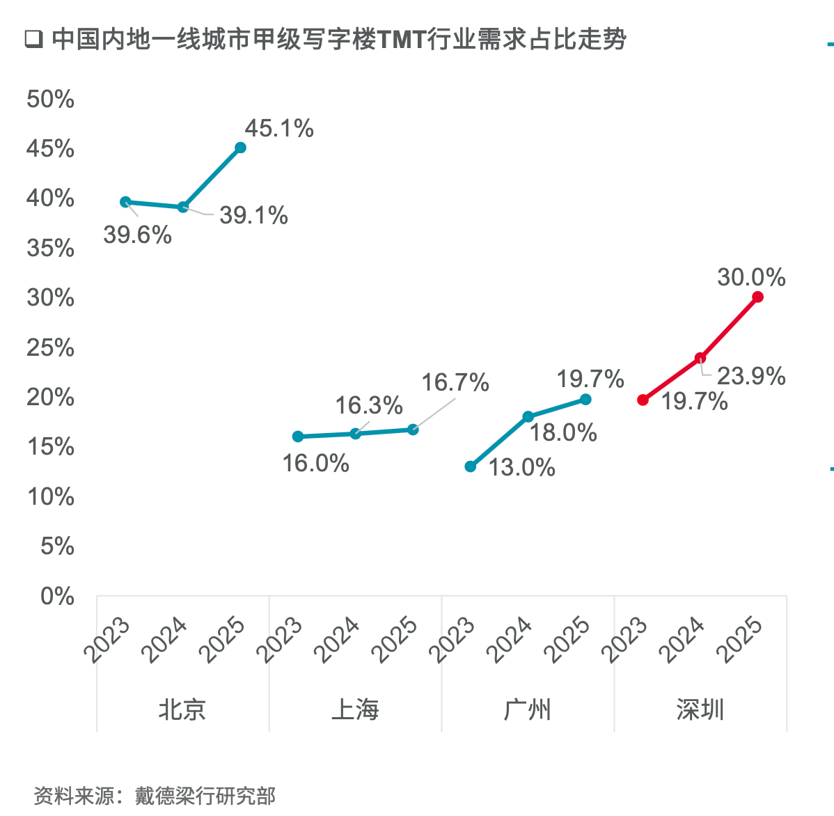 事实上,在过去的三年里,TMT行业租赁需求持续增长,需求占比从2023年的19%大幅增长至30%,增长幅度在四个一线城市中最大。