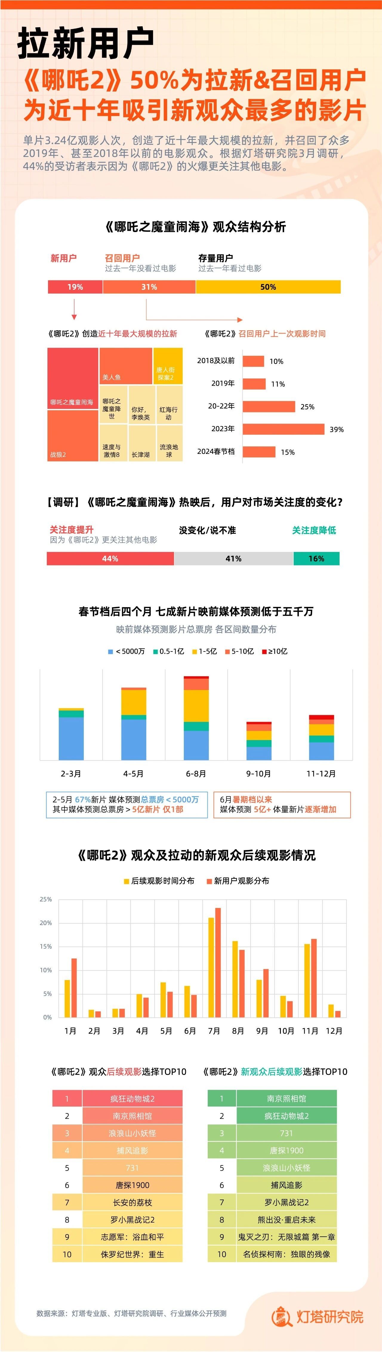 灯塔研究院发布的《2025中国电影市场年度盘点报告》则显示,《哪吒之魔童闹海》单片观影人次达3.24亿,50%为新用户,并召回了众多2019年、甚至2018年以前的电影观众。创造了近十年来最大规模的单片拉新效应。而《哪吒之魔童闹海》拉新与召回的用户,44%在2025年内形成了第二次观影。