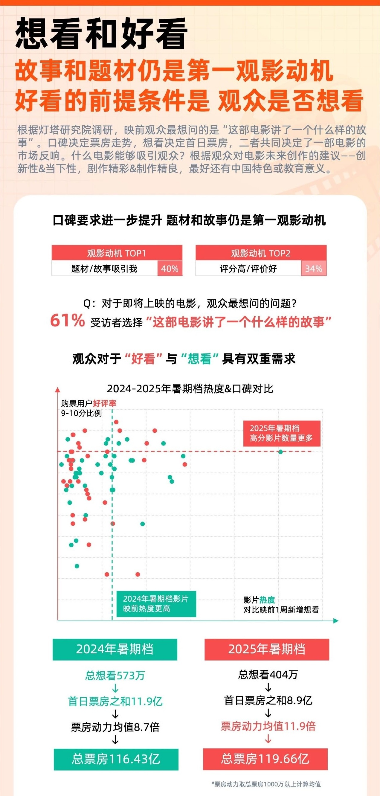 除了动画类型的突出贡献以外,2025年电影市场涌现出的不同变化也反映出观众审美和消费习惯的持续演进。当下,年轻观众选择电影院观影注重“放松解压收获快乐”,倾向娱乐性强、讨论度高的电影,更抗拒煽情与说教。根据灯塔研究院调研,映前观众最想问的是“这部电影讲了一个什么样的故事”。口碑决定票房走势,想看决定首日票房,二者共同决定了一部电影的市场反响。