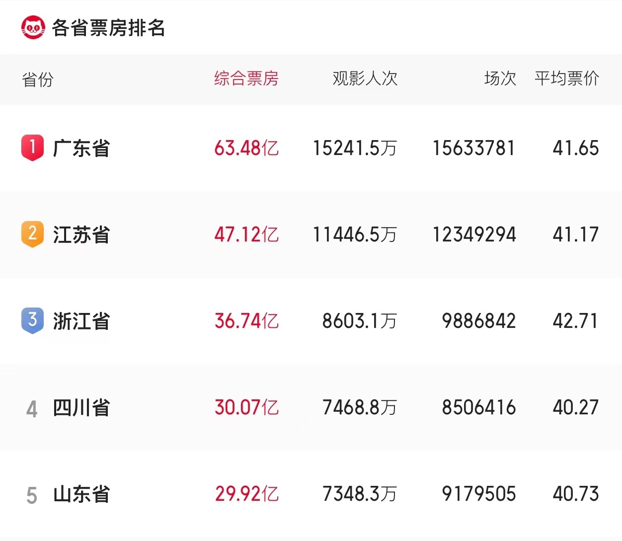 广东省2025年总票房为63.48亿元,观影人次超1.52亿,放映场次超1563万,以超12%的票房占比,连续24年蝉联全国“第一票仓”,总观影人次及放映场次亦为全国第一。2025年,广东在五一档、国庆档、暑期档等大档期均表现优异,档期票房均居全国第一,全年票房同比增长20.5%,总观影人次较2024年增长约2777万,展现出良好的票仓基础及健康的市场发展态势。