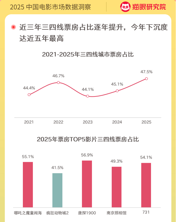 从区域结构来看,电影消费的下沉趋势进一步加强。近三年,三四线城市票房占比持续提升,2025年下沉市场贡献度达到近五年来的最高水平。与此同时,新用户和低频用户占比同比上升。随着影片进入下沉市场,电影消费的覆盖面和纵深不断拓展,为行业探索更广阔的发展空间,激活更深层的增量市场。