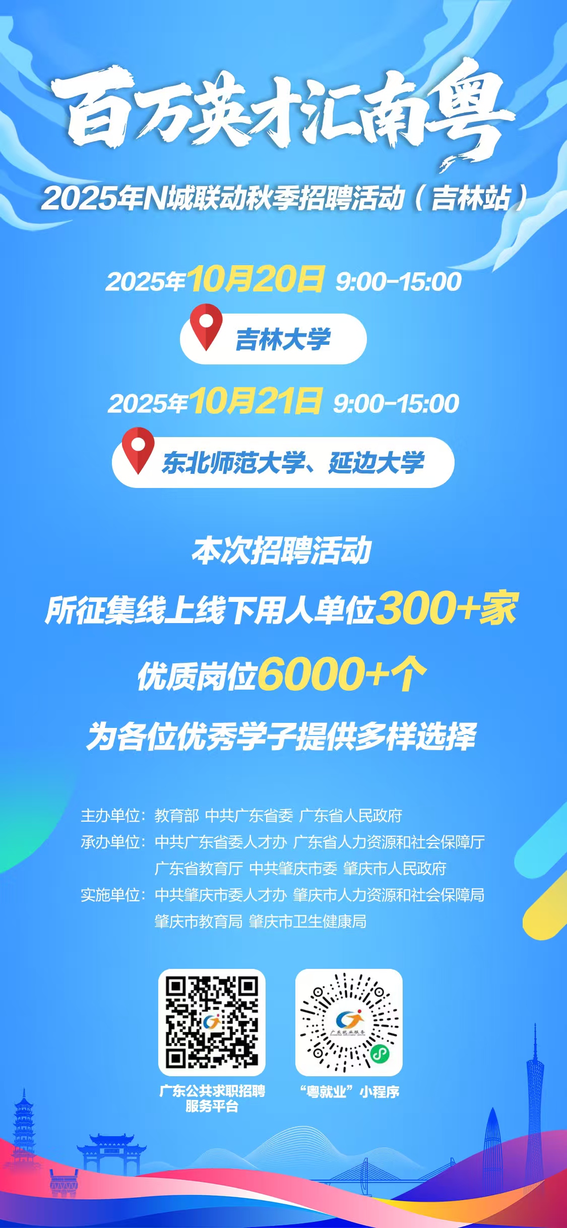 粤聚英才,粤见未来!10月20日-21日,“百万英才汇南粤”2025年N城联动秋季招聘活动(吉林站)将以“万企进百校”高校专场形式走进吉林大学、东北师范大学和延边大学,向众多高校学子发出诚挚“湾区请柬”,主动邀约高校毕业生来粤施展才干、创造未来。