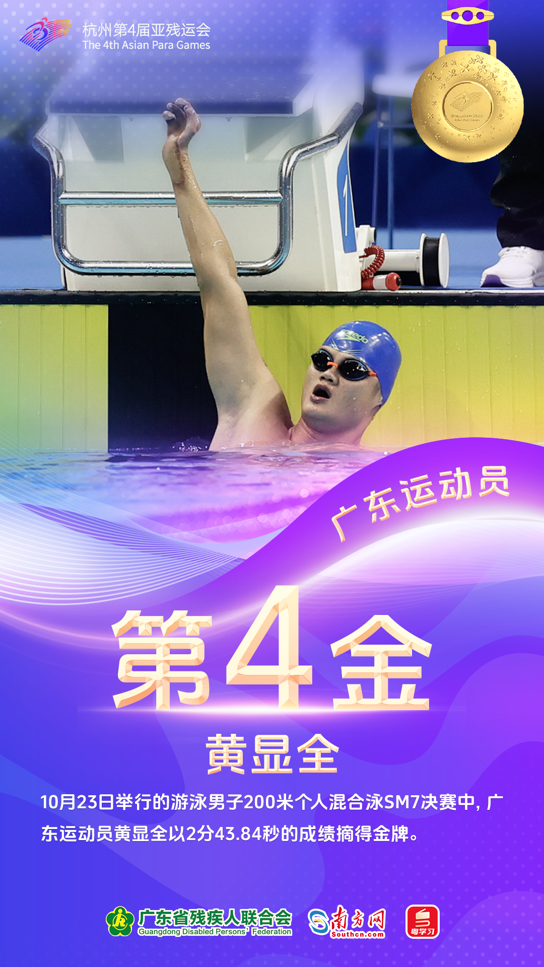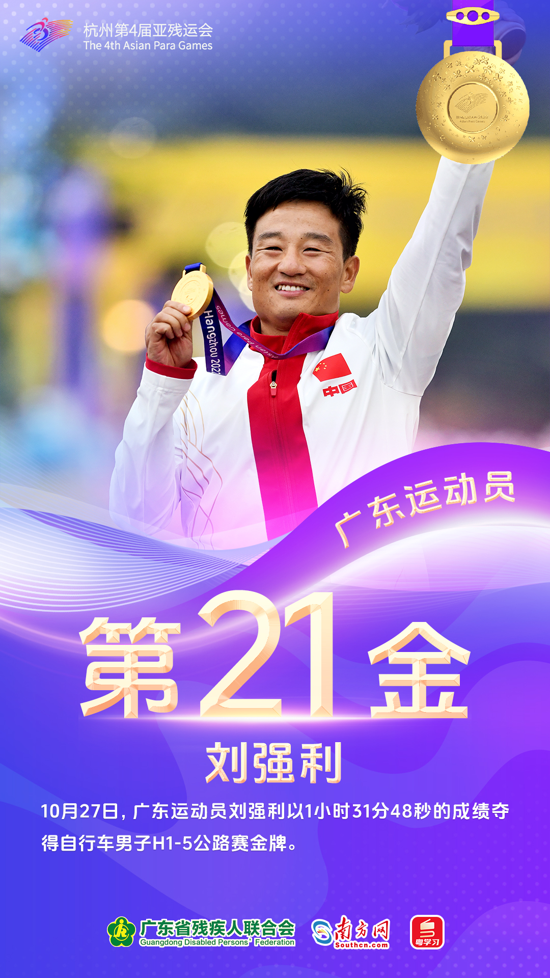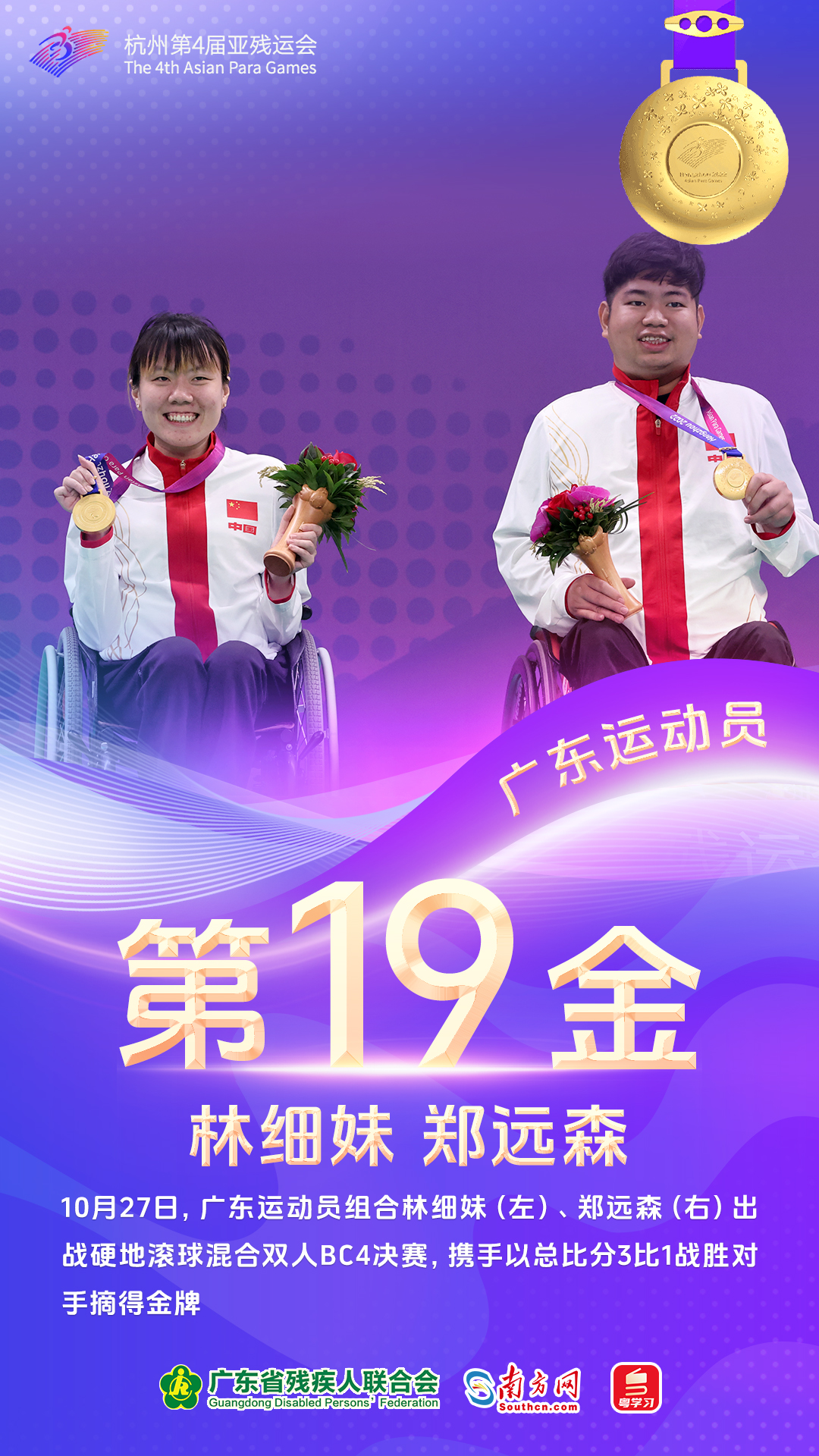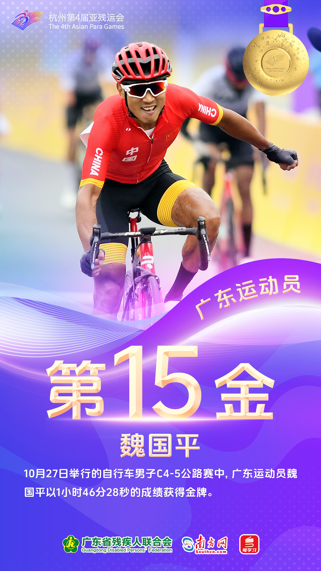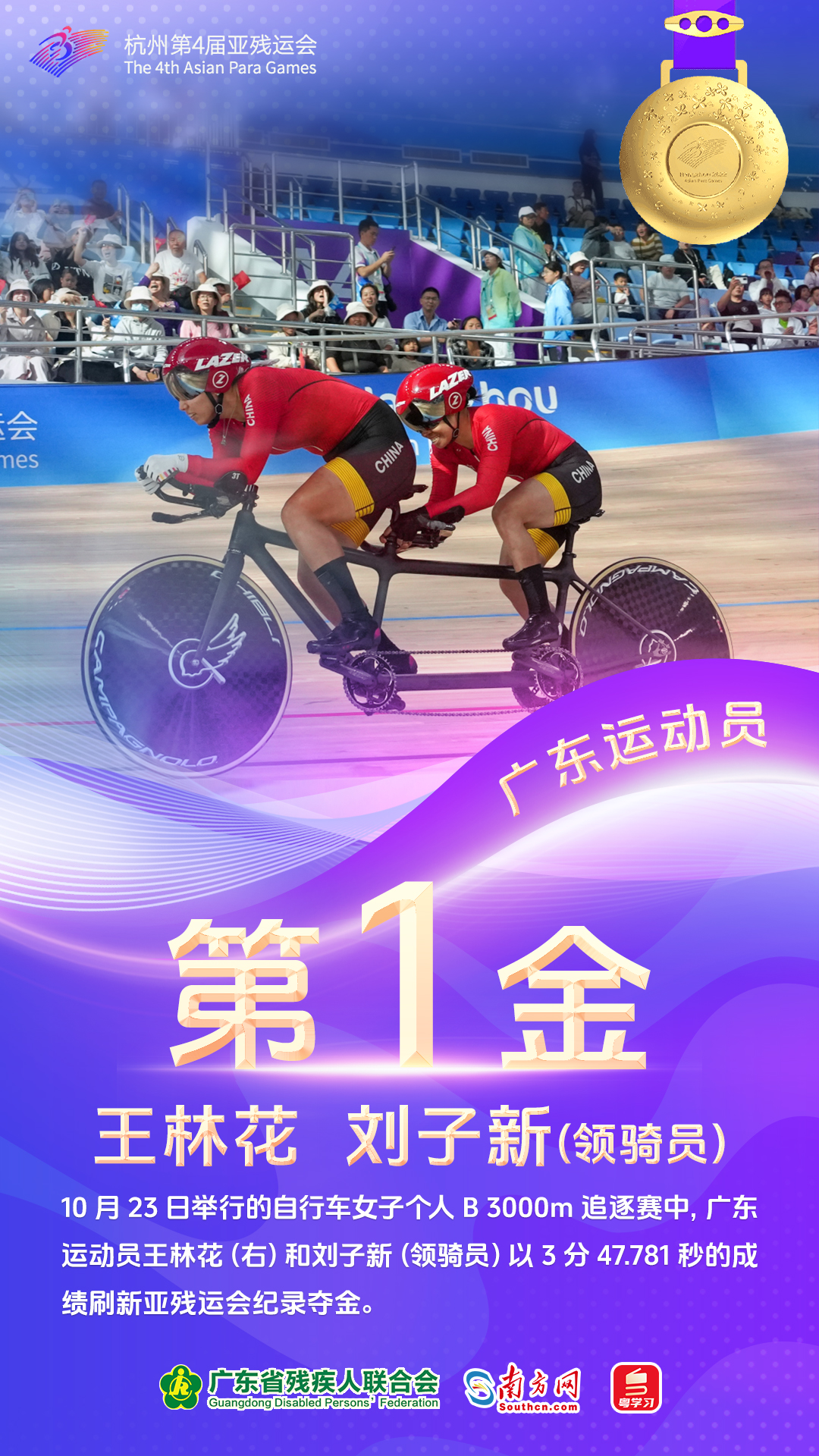 10月23日,参赛粤将揽下4金。出战自行车女子个人B 3000m追逐赛的王林花、刘子新(领骑员)组合刷新亚残运会纪录并摘下本届赛事广东运动员首金。赖善章、梁伟聪与其他三名队友合作以破亚残运会纪录的成绩登顶自行车混合团体C1-5 750m竞速赛。出战田径女子100米T13决赛的梁燕芬和出战游泳男子200米个人混合泳SM7决赛的黄显全均斩获金牌。