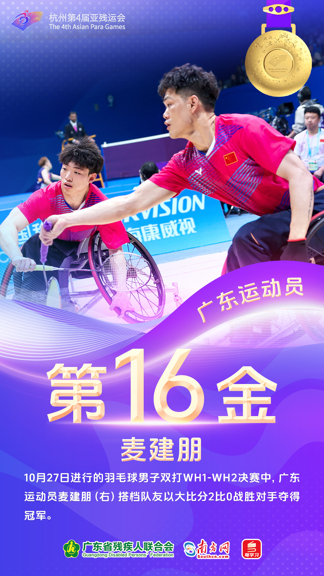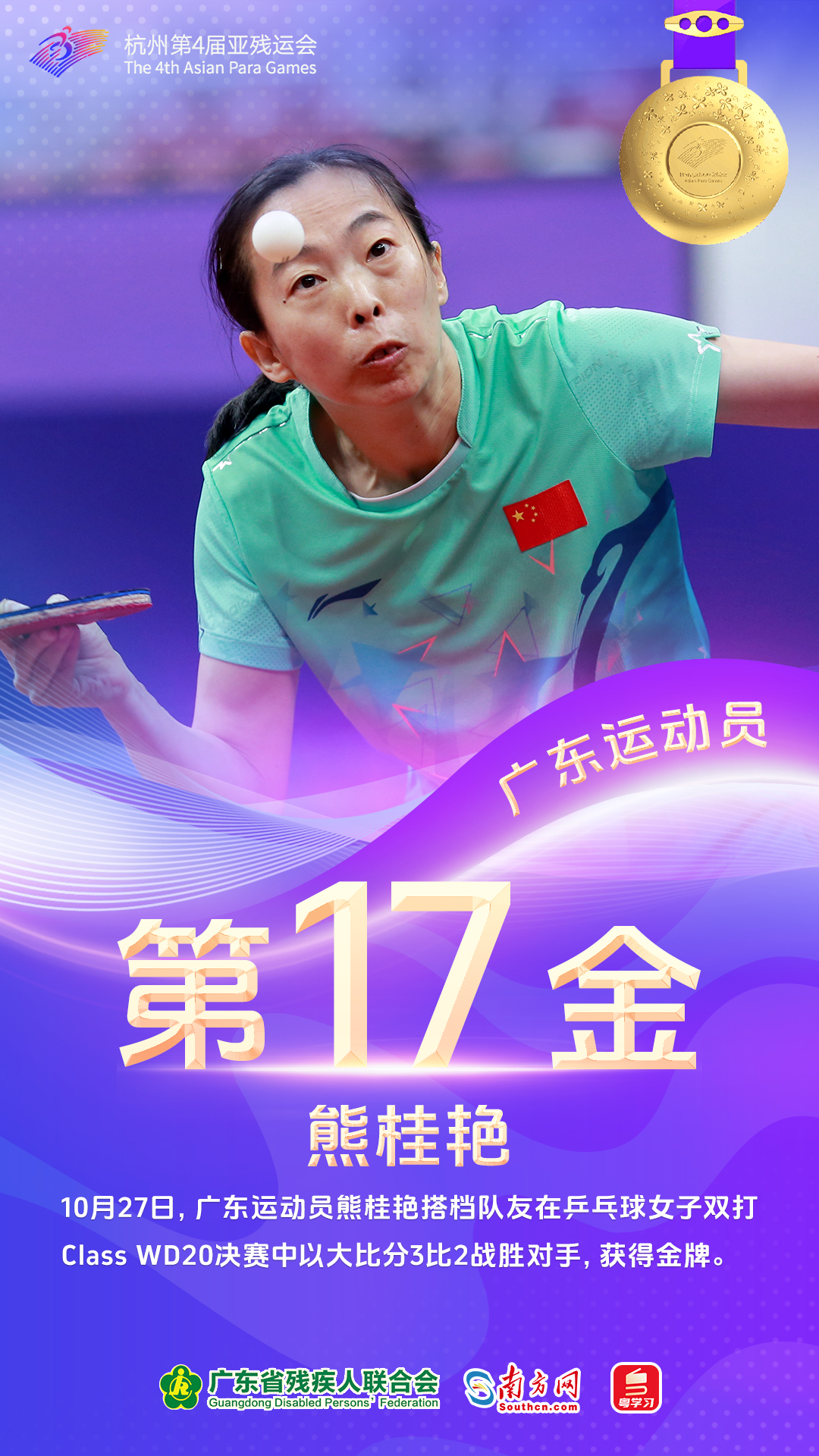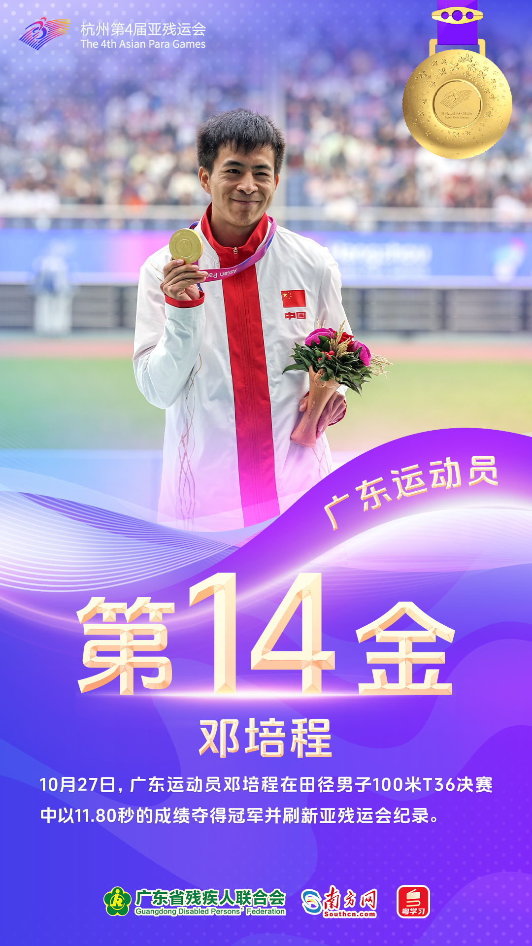 10月27日,广东运动员摘得7金。邓培程、杨义飞包揽田径男子100米T36决赛金银牌,邓培程夺冠并刷新亚残运会纪录,他在本届赛事共有2金1铜进账。魏国平、梁伟聪、孙变变、刘强利驰骋自行车公路赛,分别在各自的小项获金,梁伟聪于本届赛事累计揽下2金3银,刘强利收获2金。出战羽毛球男子双打WH1-WH2决赛的麦建朋和出战乒乓球女子双打Class WD20决赛的熊桂艳均携手各自队友夺得冠军。