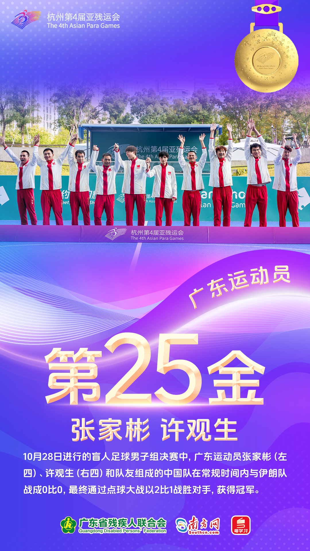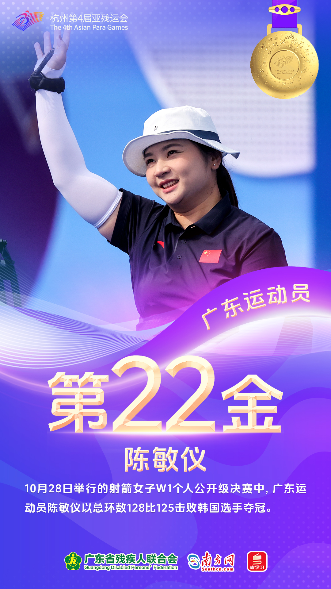 10月28日,陈敏仪“射下”射箭女子W1个人公开级比赛金牌。黄文娟搭档队友在乒乓球女子双打Class WD14决赛中战胜对手,这是她本届赛事取得的第2面金牌。周国华与领跑员贾登璞密切配合,助力中国队斩获田径4×100米混合接力金牌,累计已获1金3银。盲人足球男子组金牌赛中,中国队点球2比1战胜伊朗队夺冠,队员张家彬、许观生来自广东。至此,杭州亚残运会所有项目比赛结束,中国体育代表团共夺得214金、167银、140铜,在奖牌榜上遥遥领先。