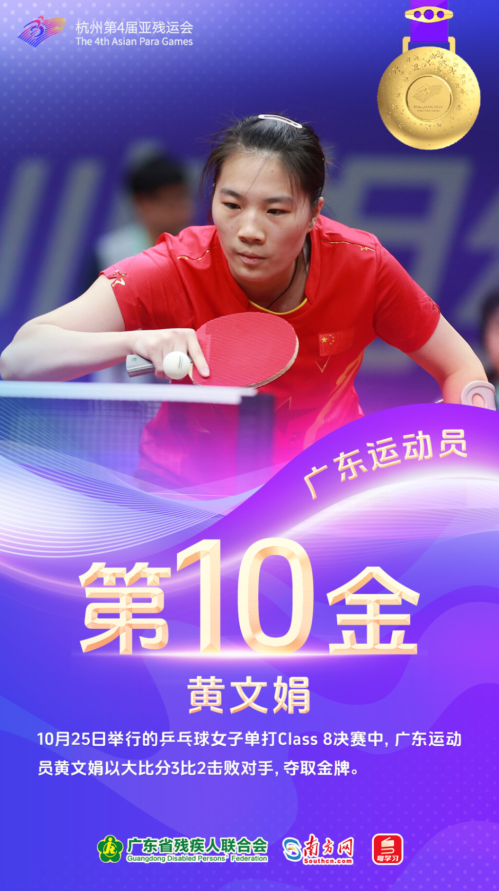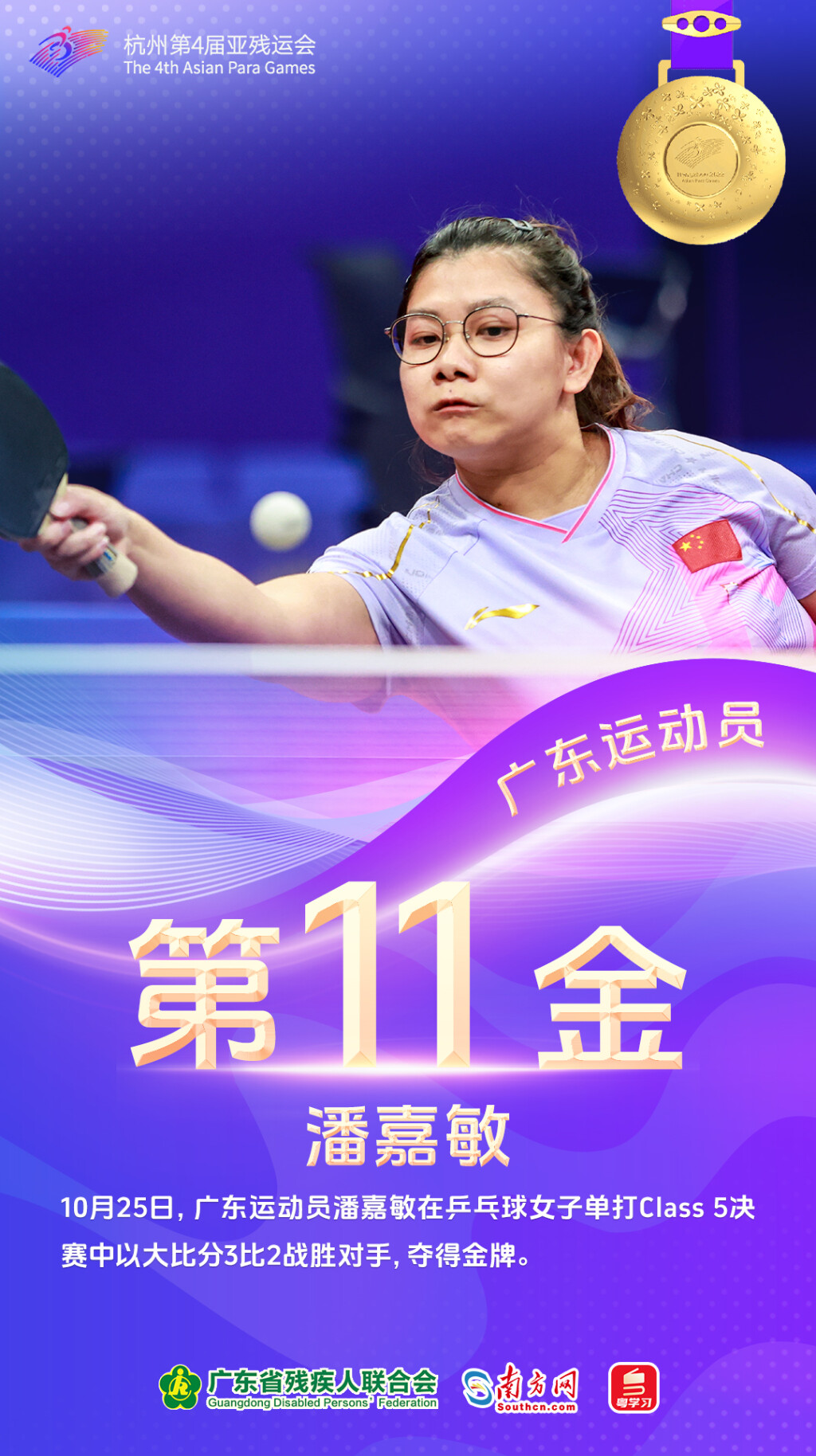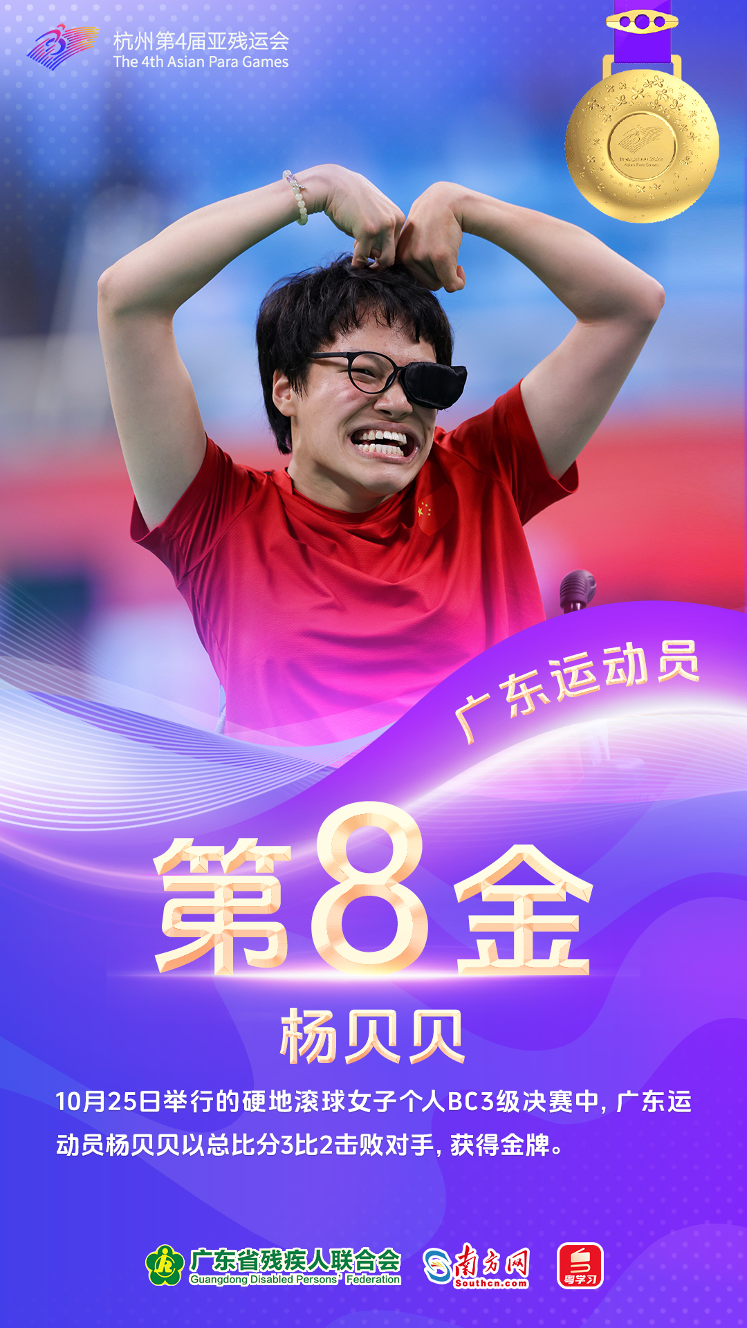 10月25日,广东运动员再夺6金。老将林月珊参加射箭女子复合弓双人团体公开级决赛,携手队友张路战胜印度队夺金。邓培程创造新亚洲记录赢下田径男子400米T36决赛冠军。爱读书、爱摄影、爱追星的女孩杨贝贝取得硬地滚球女子个人BC3级比赛的金牌。在游泳男子100米蝶泳S9决赛中,崔永佳后半程发力,获得金牌。黄文娟、潘嘉敏分别夺得乒乓球女子单打Class 8和乒乓球女子单打Class 5的冠军。