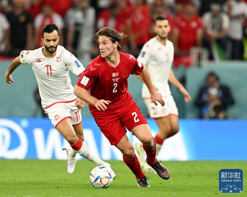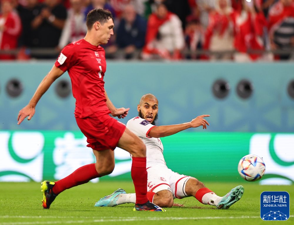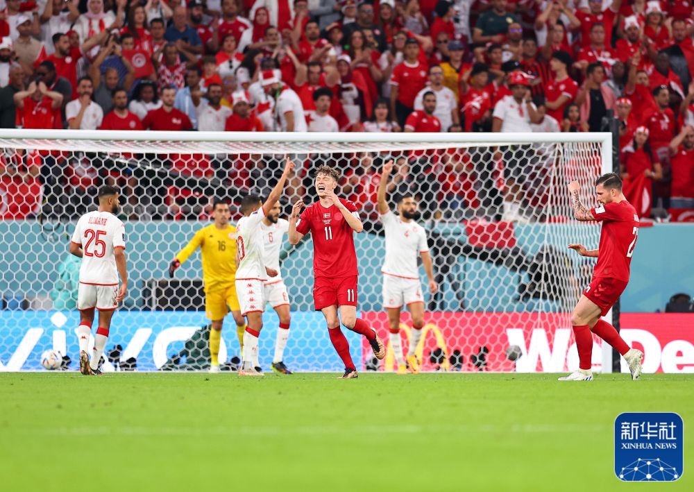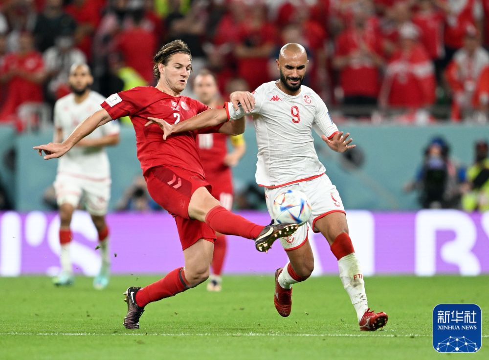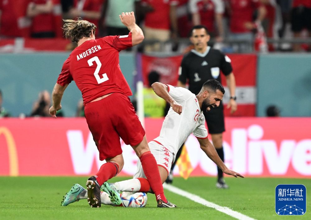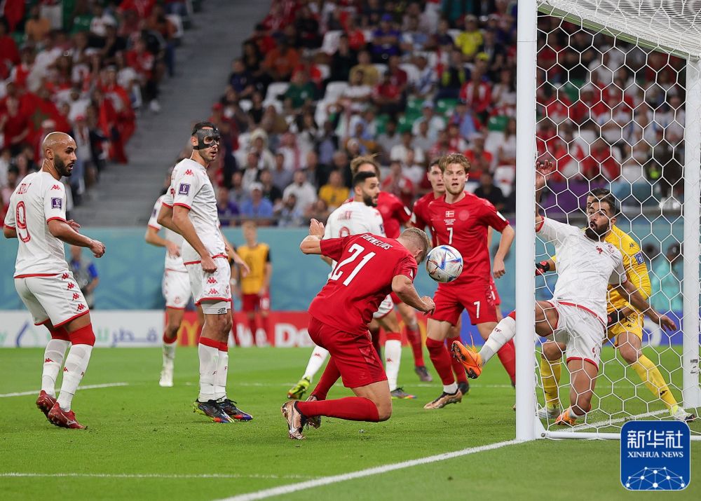 11月22日,在卡塔尔赖扬教育城球场进行的2022卡塔尔世界杯足球赛D组比赛中,丹麦队以0比0战平突尼斯队。