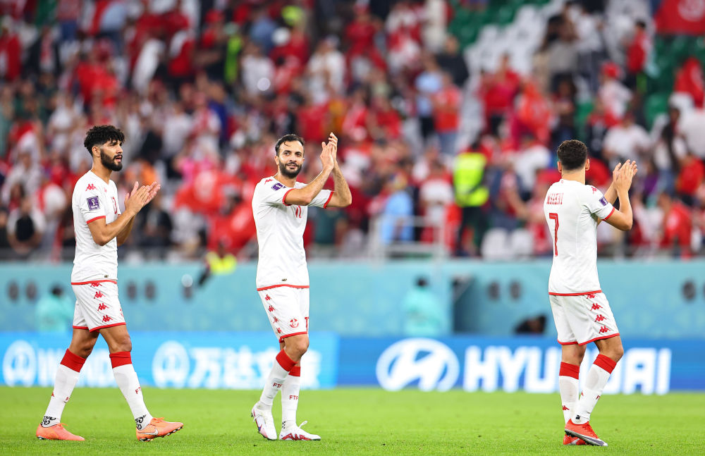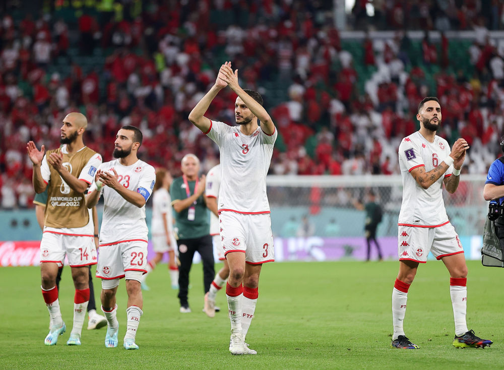 ↑突尼斯队球员艾萨·莱杜尼、纳伊姆·斯利蒂、莫塔萨尔·塔尔比和迪伦·布朗恩(从左至右)赛后向观众致意。新华社记者 王东震 摄
