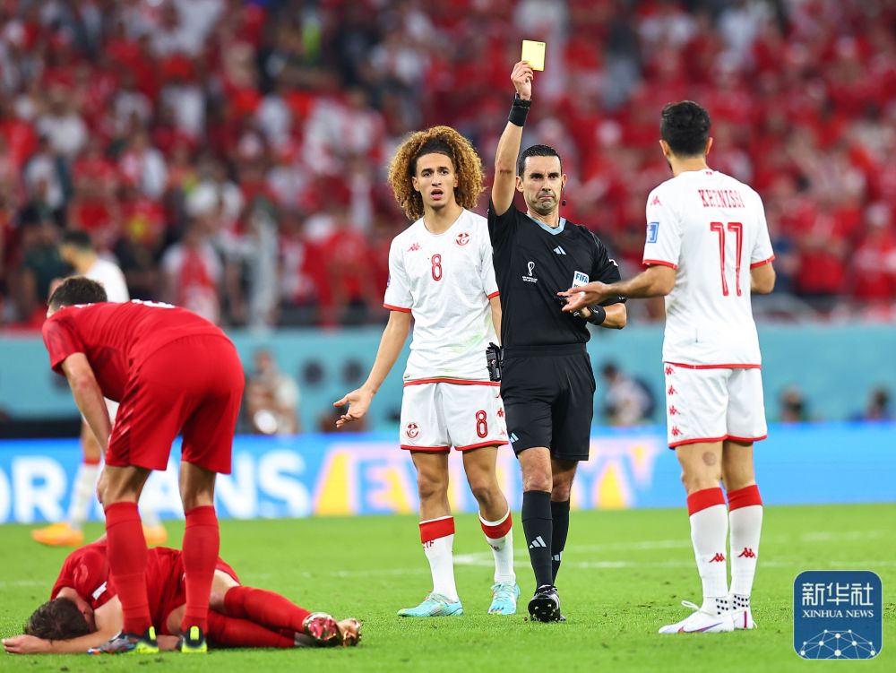 ↑裁判向突尼斯队球员塔哈·赫尼希(右一)出示黄牌。新华社记者 丁旭 摄