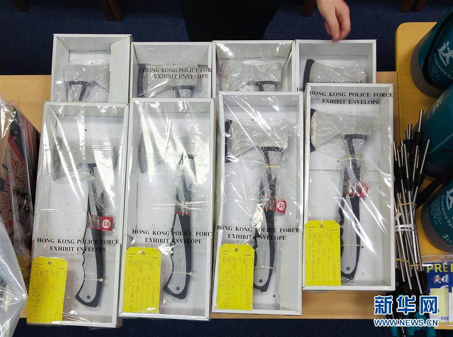 9月1日,在港岛西区警署召开的记者会上,警方展示拘捕现场检获的斧头等证物。新华社记者 刘大伟 摄