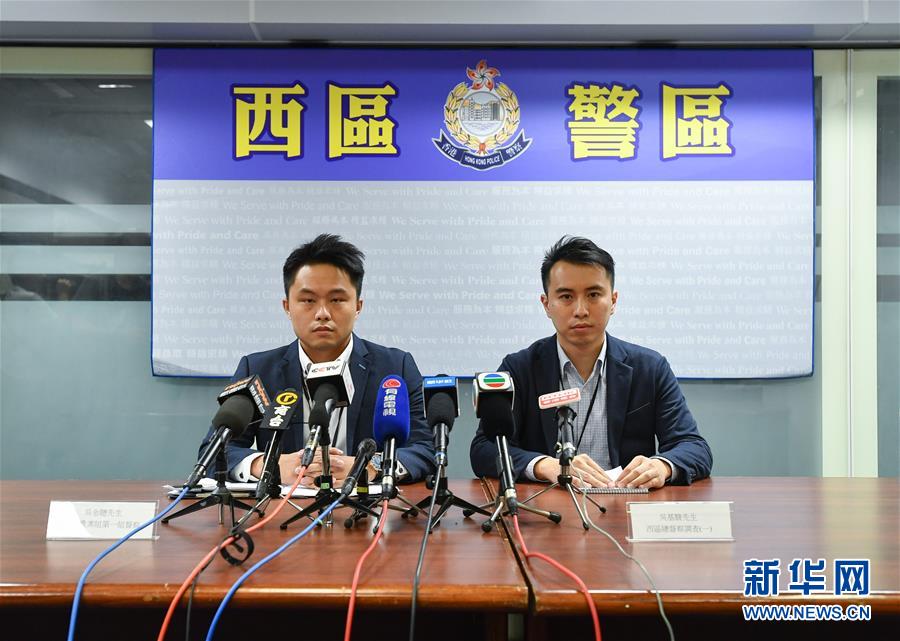 9月1日,在港岛西区警署召开的记者会上,西区警区刑事总督察吴基骏(右)介绍情况。 新华社记者 刘大伟 摄