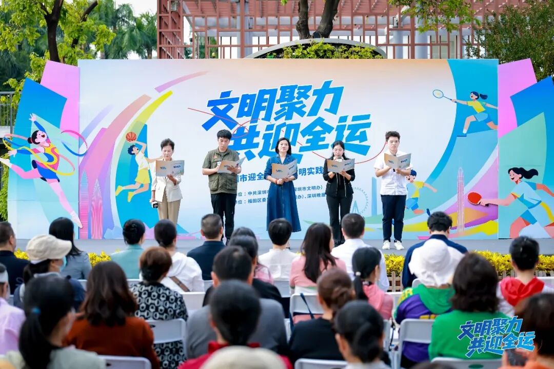 快闪之后,女子围棋世界冠军徐莹、全国文明家庭代表郭丽英、广东省最美志愿者代表黄国成、深圳垃圾分类蒲公英志愿讲师王芸、深港青年学生代表张谷琦五位嘉宾共同登台,齐声诵读《迎十五运会和残特奥会文明倡议书》。
