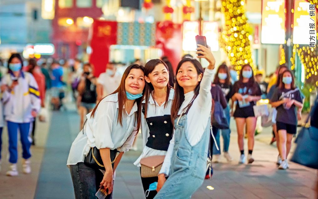 游客在广州市北京路步行街打卡拍照留念