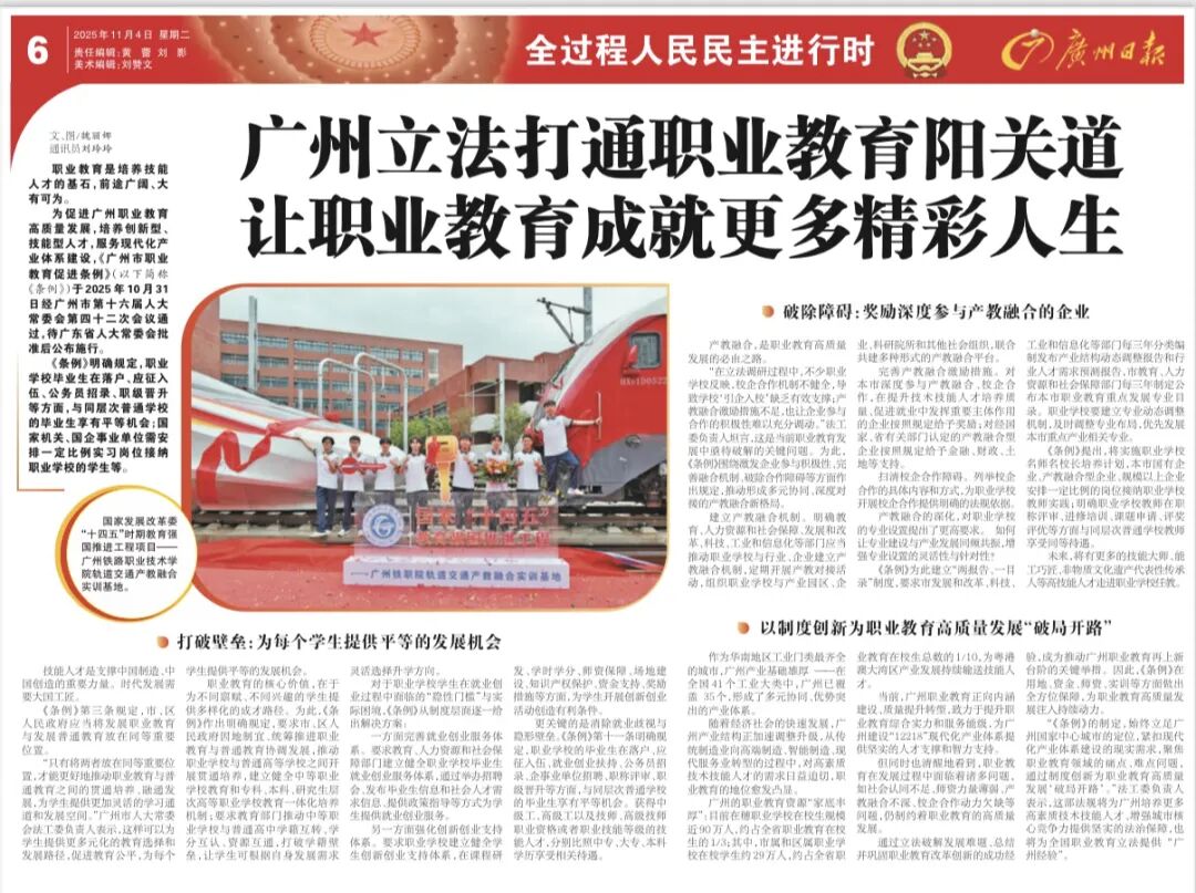 为促进广州职业教育高质量发展,培养创新型、技能型人才,服务现代化产业体系建设,《广州市职业教育促进条例》(以下简称《条例》)于2025年10月31日经广州市第十六届人大常委会第四十二次会议通过,待广东省人大常委会批准后公布施行。