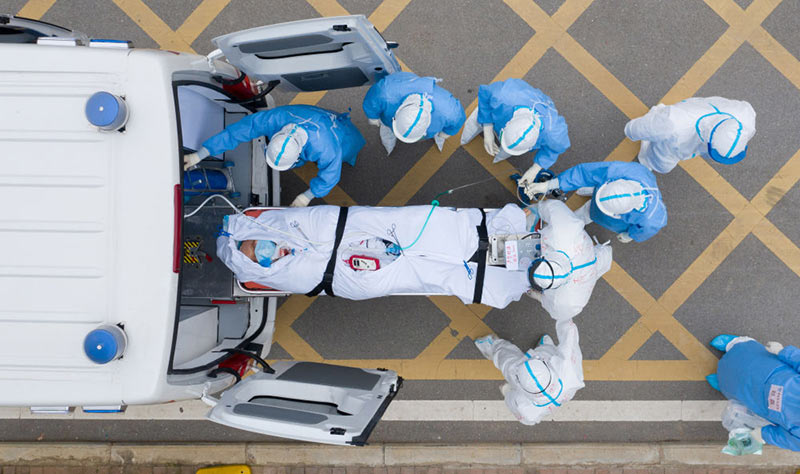 2020年3月6日,在湖北省武汉市的华中科技大学附属同济医院中法新城院区,医护人员用负压救护车转运一位新冠肺炎患者做CT检查(无人机照片)。这一年,习近平总书记站在擘画新征程的起点,始终把人民放在第“一”位,坚持“一”盘棋意识,追求“一”流永无止境……