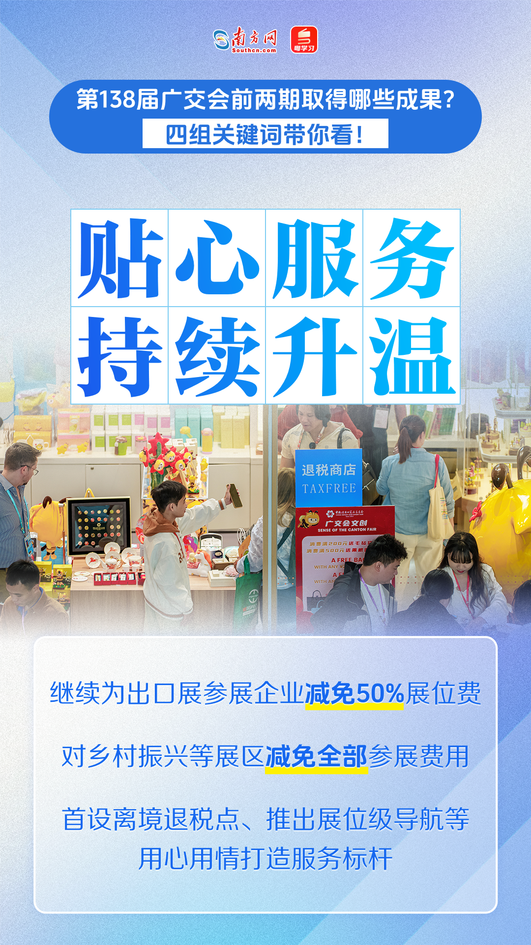 四是“贴心服务”持续升温。本届广交会继续为出口展参展企业减免50%展位费,对乡村振兴等展区减免全部参展费用。首次设置离境退税点、推出展位级导航、APP办证、AI辅助审图、试点模块化搭建,用心用情打造服务标杆,获得各方好评。