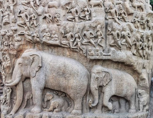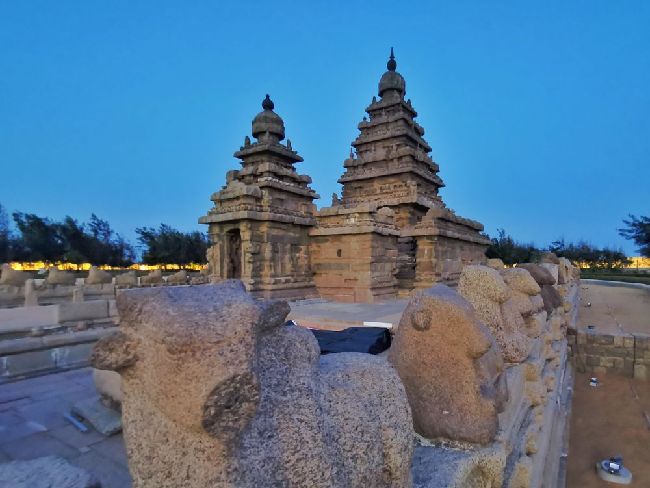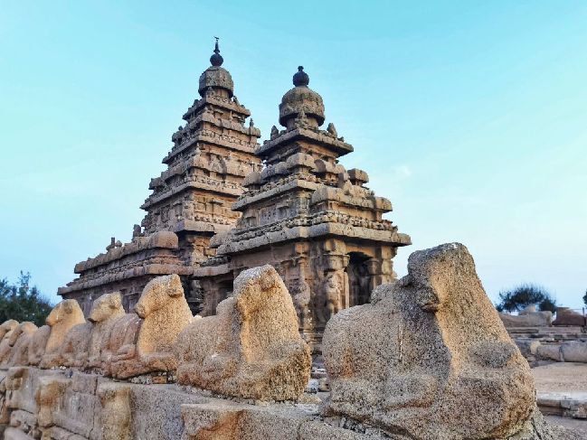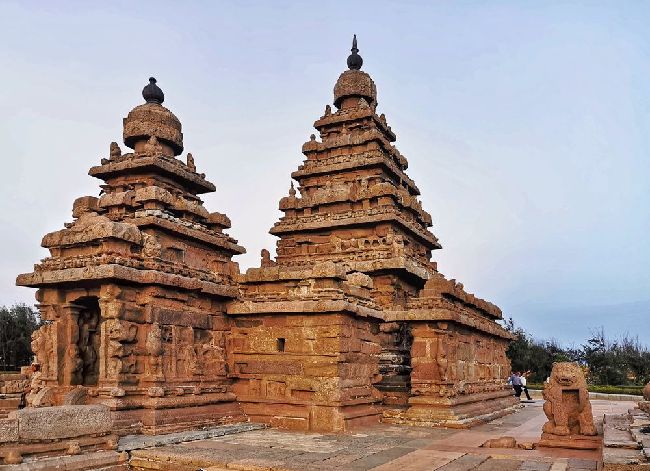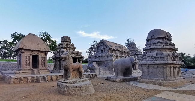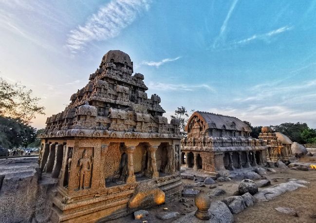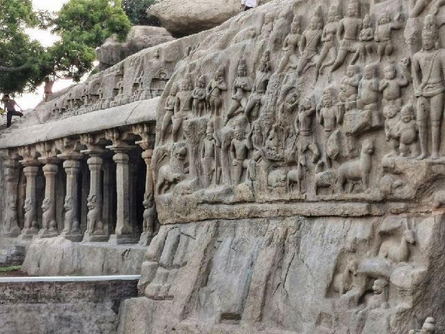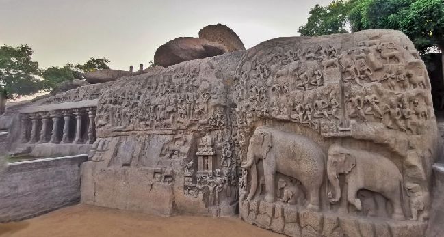 马哈巴利普拉姆古寺庙建于公元7至8世纪,由阿周那石雕、五战车神庙、海岸神庙等古迹组成。