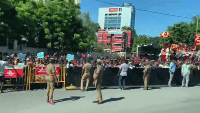 习主席的车队驶离机场前往市区沿途,众多当地学生和群众簇拥在街道两旁,挥舞中印两国国旗,手举习主席和莫迪总理照片,欢呼“中印友好”,表达对习主席的热烈欢迎。