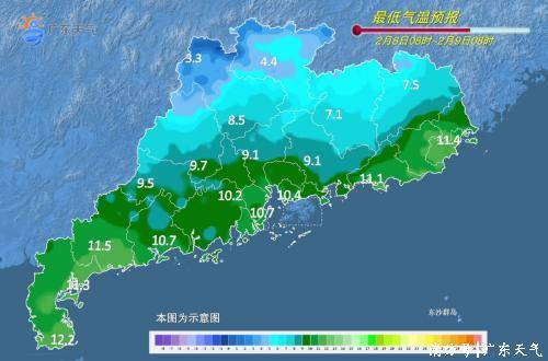 8日,中南部市县阴天,有小雨局部中雨,其余市县阴天为主,有小雨,粤北高海拔地区局部有冰冻。最低气温:粤北、珠江三角洲北部市县3℃~8℃,其中高海拔山区零下2℃~2℃,南部沿海市县12℃~17℃,其余市县8℃~11℃。
