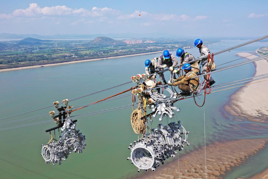 2022年9月16日,白鹤滩至浙江±800千伏特高压直流输电工程(白浙线)安徽段顺利完成长江大跨越放线作业。白浙线是我国实施“西电东送”战略的重点工程(无人机照片)。新华社发(赵献富 摄)