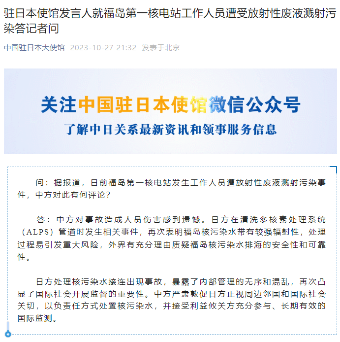 据“中国驻日本大使馆”微信公众号消息,10月27日,中国驻日本大使馆发言人就福岛第一核电站工作人员遭受放射性废液溅射污染答记者问。