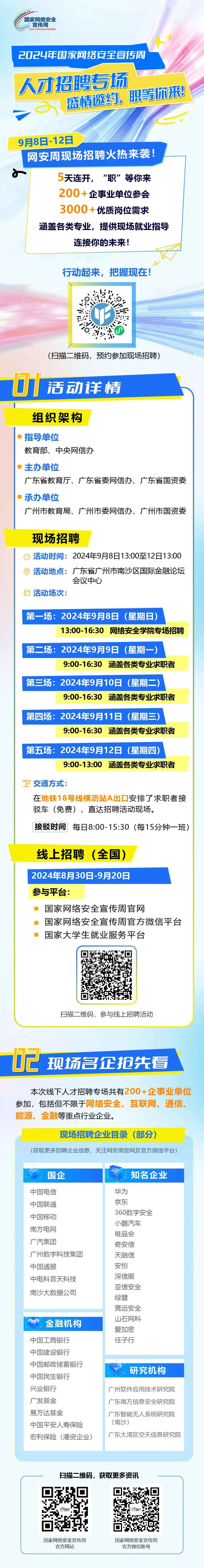 据了解,本次参与现场招聘的企业数量达230余家,包括网络安全、互联网、通信、能源、金融等重点行业企业,涵盖大型国央企、广东省市国企、金融机构、科研机构、知名企业等,提供岗位3000余个。