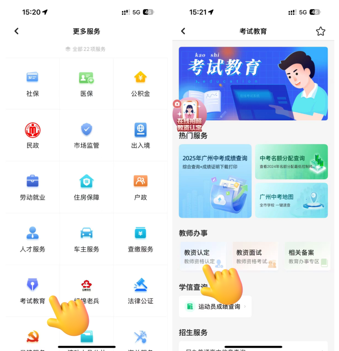 3、认定材料确认环节需要申请人完成以下三个步骤:一是“中国教师资格网”报名时选择参与“全程网办”,申请人可在报名时上传材料。二是下载并安装“穗好办”APP,完成证件照上传,三是及时在规定时间内到广州市内各区指定医院完成体格检查。以上材料未在规定时间内完成提交的,各区认定机构将不会审核申请人材料,按材料不齐全处理。其中“穗好办”APP材料首次提交时间截至10月24日17:00,完成首次提交的申请人后续可对材料进行修改,未完成首次提交的按材料不全处理;