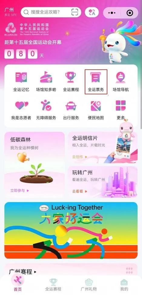 在“全运广州”小程序首页,点击“全运票务”按钮,按照页面指引即可购买十五运会和残特奥会赛事门票。