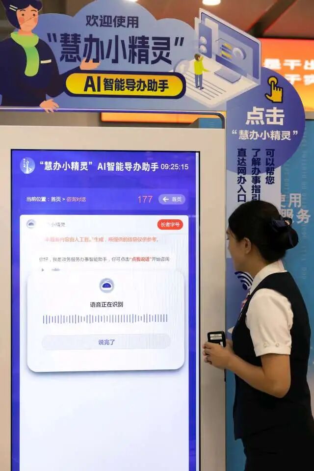 如果说跨境设备展示了城市治理的开放,那么AI智能导办助手“慧办小精灵”则体现了贴心的智慧服务。它的智慧大脑源自DeepSeek大模型,整合了近10万条办事指南。