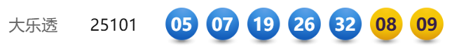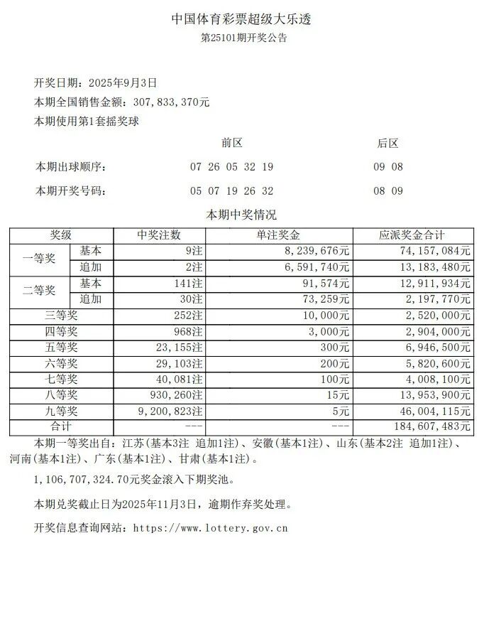 9月3日,超级大乐透第25101期开奖。前区开出号码05、07、19、26、32;后区开出号码08、09。本期全国销售3.07亿元,为国家筹集彩票公益金1.10亿元。其中,广东湛江中得1注基本投注一等奖,出自4407007117体彩实体店。