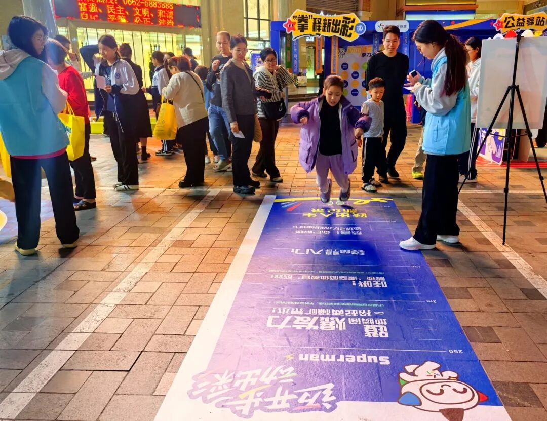 每个游戏区域都人气爆棚。投篮游戏区前,老少参与者轮番上阵,投中的欢呼与失手的惋惜交织;跳远垫上,孩子们奋力一跃,赢得阵阵掌声;足球门前,父子齐上阵,场面温馨;保龄球赛道旁,随着保龄球瓶的轰然倒地,现场欢呼声此起彼伏。大家手持集章卡,穿梭于各个游戏点之间,为了集齐四枚印章而全力以赴,整个广场充满了运动的活力与竞技的乐趣。