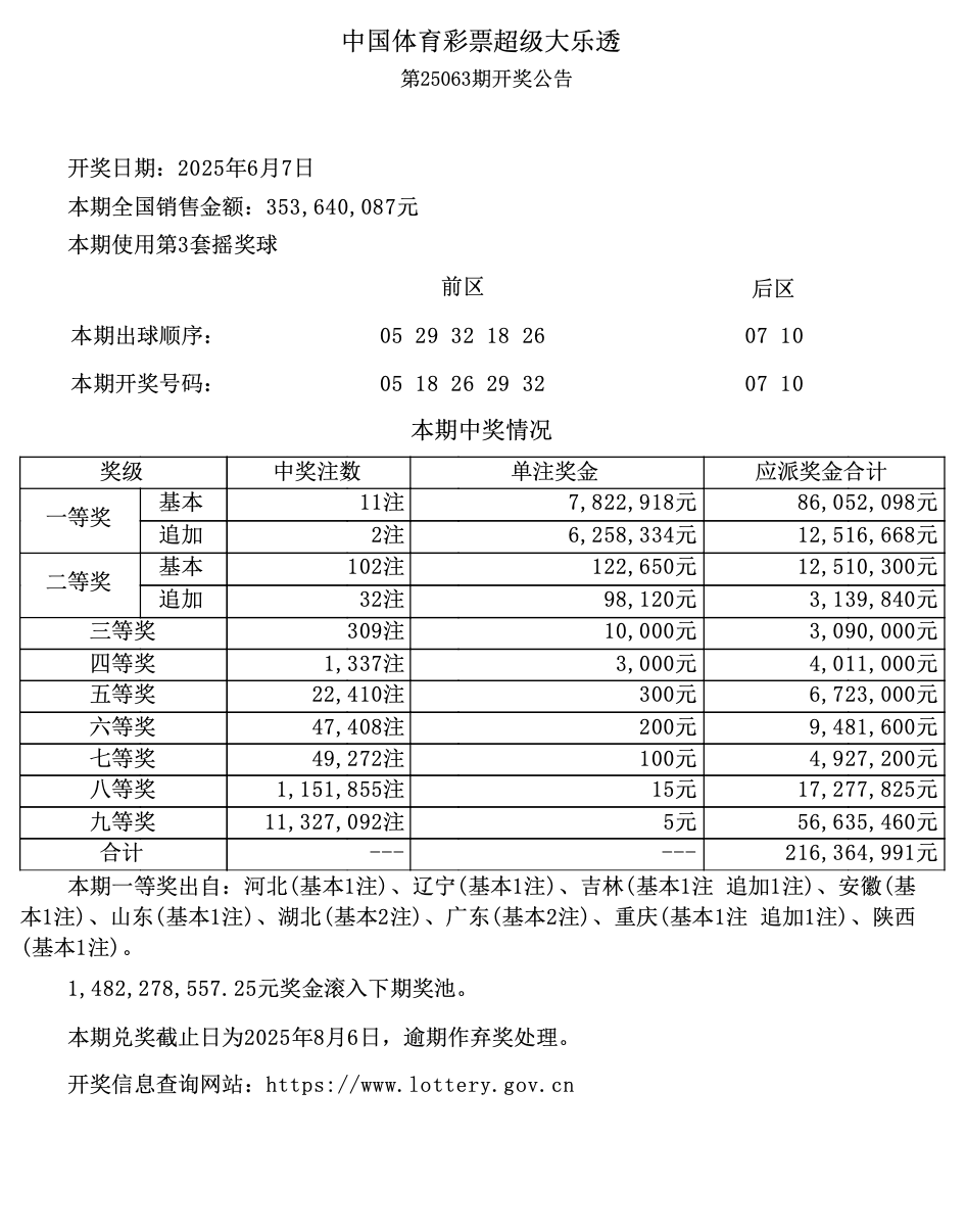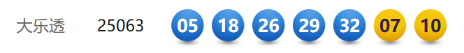 6月7日,超级大乐透第25063期开奖。前区开出号码05、18、26、29、32;后区开出号码07、10。本期全国销售3.53亿元,为国家筹集彩票公益金1.27亿元。其中,广东广州中得1注基本投注一等奖,出自4401031602体彩实体店;广东东莞中得1注基本投注一等奖,出自4417017902体彩实体店。