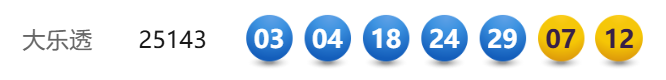 12月15日,超级大乐透第25143期开奖。前区开出号码03、04、18、24、29;后区开出号码07、12。本期全国销售2.92亿元,为国家筹集彩票公益金1.05亿元。