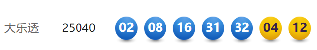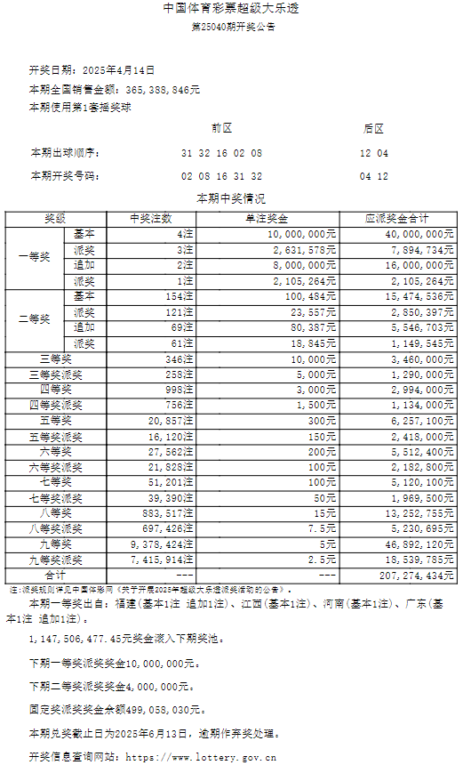 4月14日,超级大乐透第25040期开奖。前区开出号码02、08、16、31、32;后区开出号码04、12。本期全国销售3.65亿元,为国家筹集彩票公益金1.314亿元。其中,广东广州中得1注追加投注一等奖,出自4401032317体彩实体店。