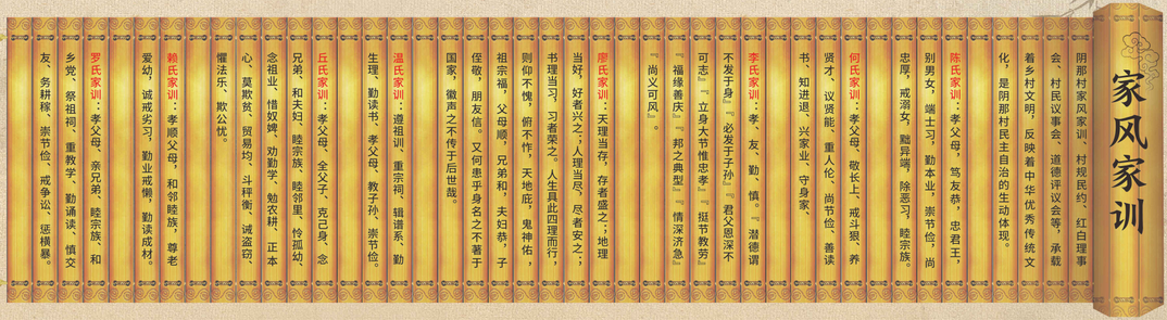 阴那村家风家训、村规民约、红白理事会、村民议事会、道德评议会等,承载着乡村文明,反映着中华优秀传统文化,是阴那村民主自治的生动体现。陈氏家训:孝父母,笃友恭,忠君王,别男女,端士习,勤本业,崇节俭,尚忠厚,戒溺女,黜异端,除恶习,睦宗族。