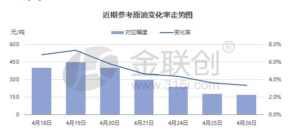 据卓创资讯数据监测模型显示,截至4月26日收盘,国内第9个工作日参考的原油变化率为3.49%,预计汽柴油上调幅度为145元/吨,折算为升价,92号汽油上调0.11元/升,95号汽油及0号柴油均上调0.12元/升。
