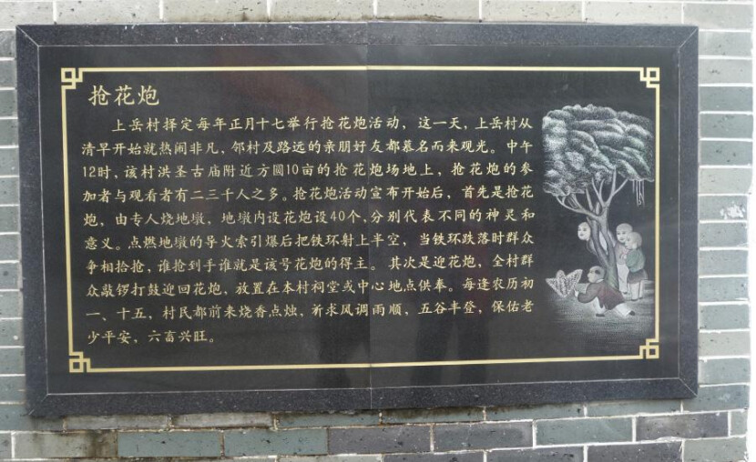 抢花炮活动,佛冈许多地方都有举办,上岳村择定每年正月十七举行抢花炮活动。这一天,上岳村从清早开始就热闹非凡,每家每户有接待许多亲朋好友慕名而来观光。中午12时,洪圣古庙街近方圆近10亩的抢花炮场地,有抢花炮的参加者与观看者达二三千人之多。
