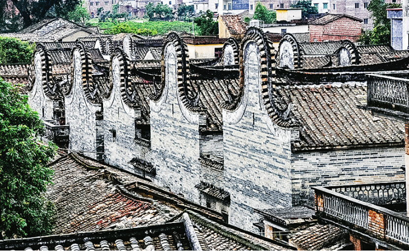 五龙过脊也是上岳古村锅耳楼屋宇的特殊建筑风格。其特别之处:坐西北向东南,由两栋锅耳楼组成,前一栋为三间两进两锅耳山墙,后一栋为三间三进三锅耳山墙,加起来共五个锅耳山墙。所以称为“五龙过脊”。五龙过脊面阔11.7米,进深46.3米,前一栋高7.5米,后一栋高8米。该建筑物属于砖木结构,青砖墙,龙船脊,硬山顶,盖灰瓦,方砖铺地,屋檐有精美的灰塑草尾图案。建筑总体布局合理,具有鲜明的岭南艺术建筑风格。
