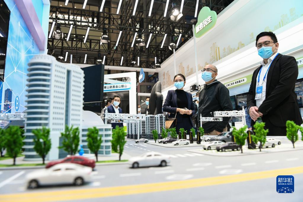 在深圳举行的第二十三届中国国际高新技术成果交易会智慧城市展区,观众了解华为智能网联(2021年12月27日摄)。新华社记者 梁旭 摄