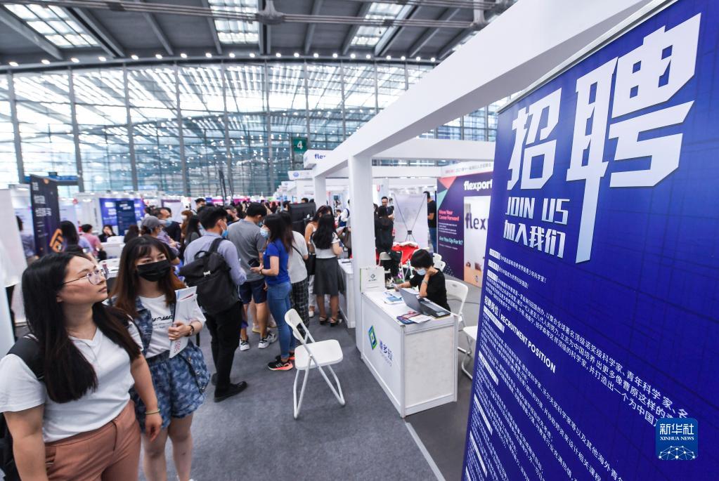 在深圳举行的中国国际人才交流大会海归人才招聘会上,求职人员查看招聘信息(2021年4月24日摄)。新华社记者 毛思倩 摄
