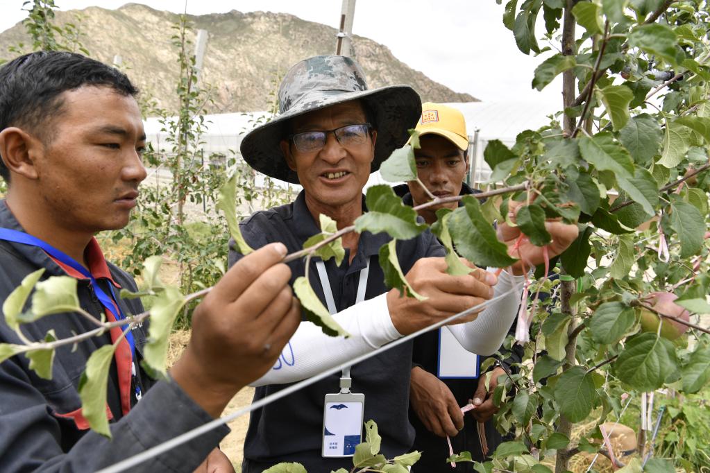 技术人员(中)在指导森布日村村民管理苹果树(资料图)。新华社记者张汝锋摄