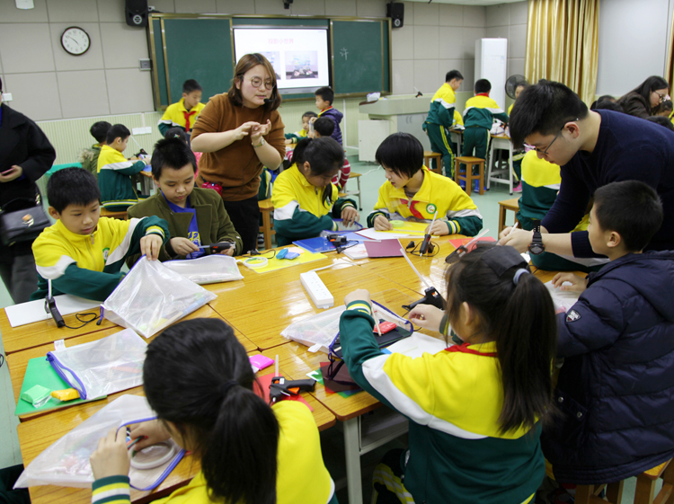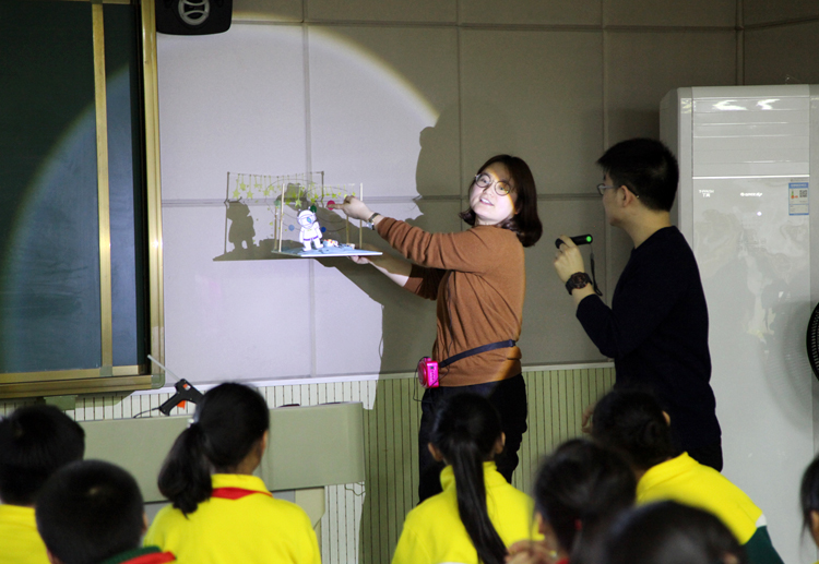 当天,英德市七小50个班的学生代表及部分一起分享了《创想未来》的课程。在《光影小世界》试听课上,孩子们在老师的引导下自主探索材料的运用,完成投影作品。在授课过程中,老师对孩子们只有标准的任务要求,没有任何标准的答案,孩子们通过动手实践呈现出各具特色的投影装置作品。