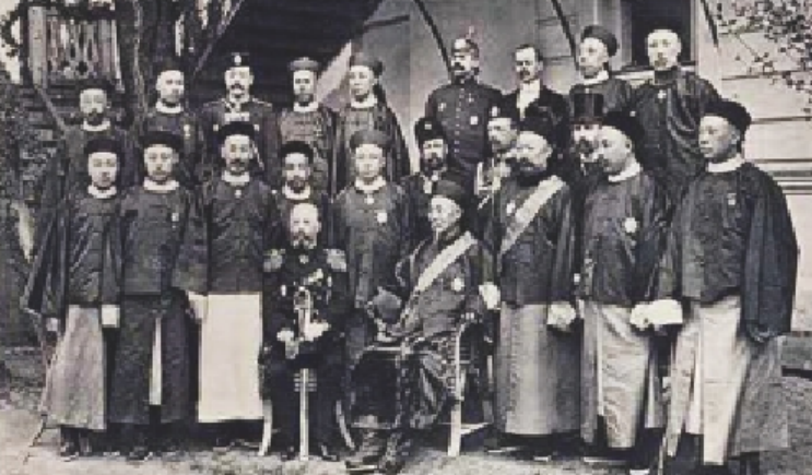 1896年,麦信坚(二排左四)随李鸿章(一排右一)出使俄国,参加沙皇尼古拉二世的加冕典礼。