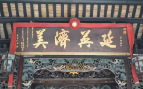 (敬祖麦公祠神龛上挂木匾“延英济美”,落款麦志仁书)